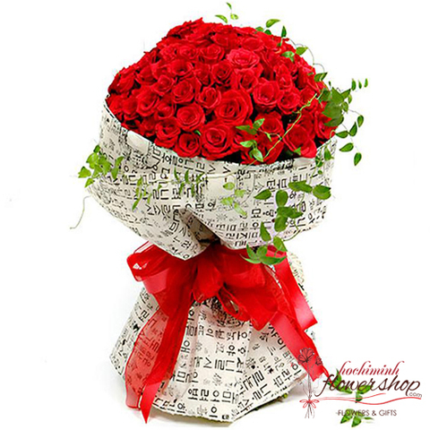 Amaze your love with this bouquet of red roses from Hochiminh Flower Shop. This exclusive bunch of 99 roses with some seasonal fillers packed in a nice white paper tied with a red knot will surely bring a smile on the face of your loved ones. Get this lovely bouquet online.
