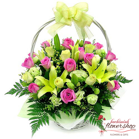 Basket of pink roses and yellow lilies