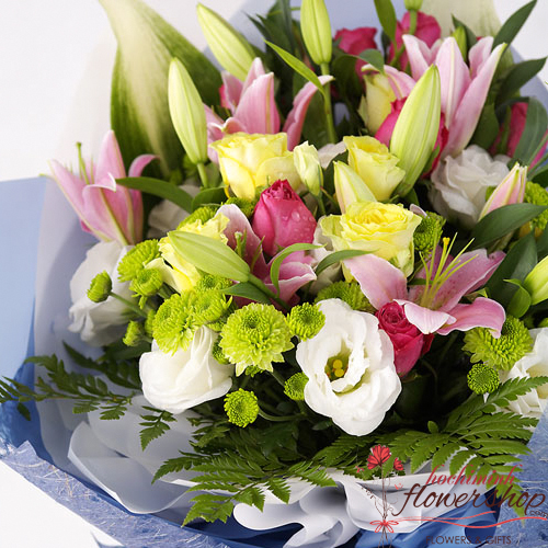 This is a classic piece of arrangement of many flowers in just one bouquet. In this bouquet you will get pink lilies, yellow rose, lisianthus, green daisies with seasonal filler packed in a blue paper and tied up with a blue ribbon. Send this mixed bouquet to someone special for expressing your feelings.