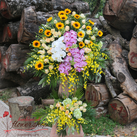 This bouquet will speak to your feelings loudly and proudly. Good choice to send your blessing for friends with a new store opening. This chief flower of this opening congratulation flowers stand is roses, sunflowers, phanaenopsis orchid, hydrangea with matching flowers and greens.