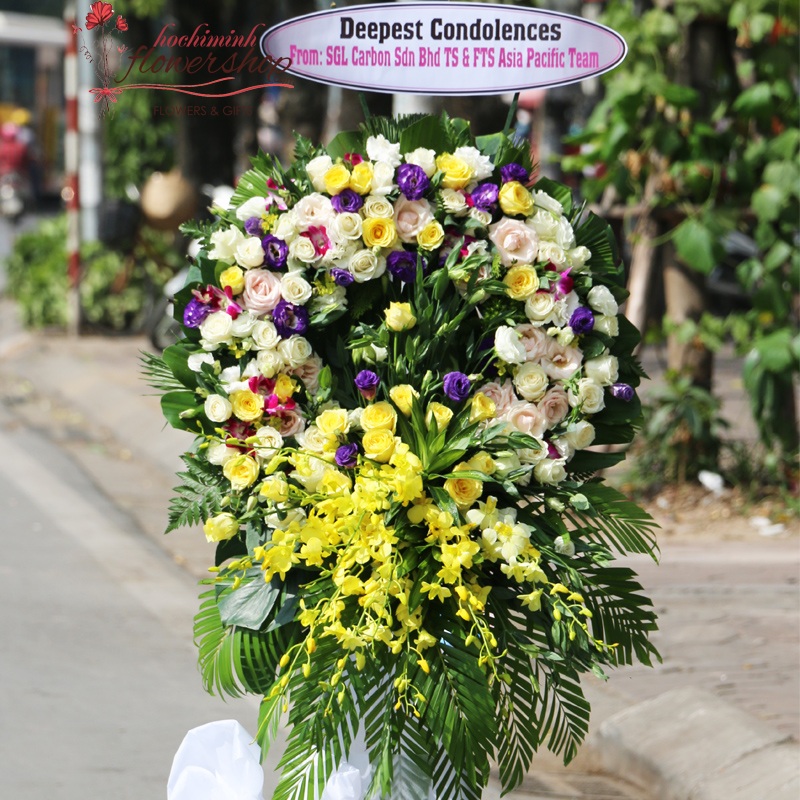 This beautiful wreath stands as a testament to the circle of life that must be acknowledge even in our saddest moments. It will surely be appreciated by all in attendance. Dazzling blooms such as pink lily, purple dendrobium orchid, daisy, rose and button spray chrysanthemums along with fern and other fresh greens create a beautiful wreath that comes delivered on an easel.
